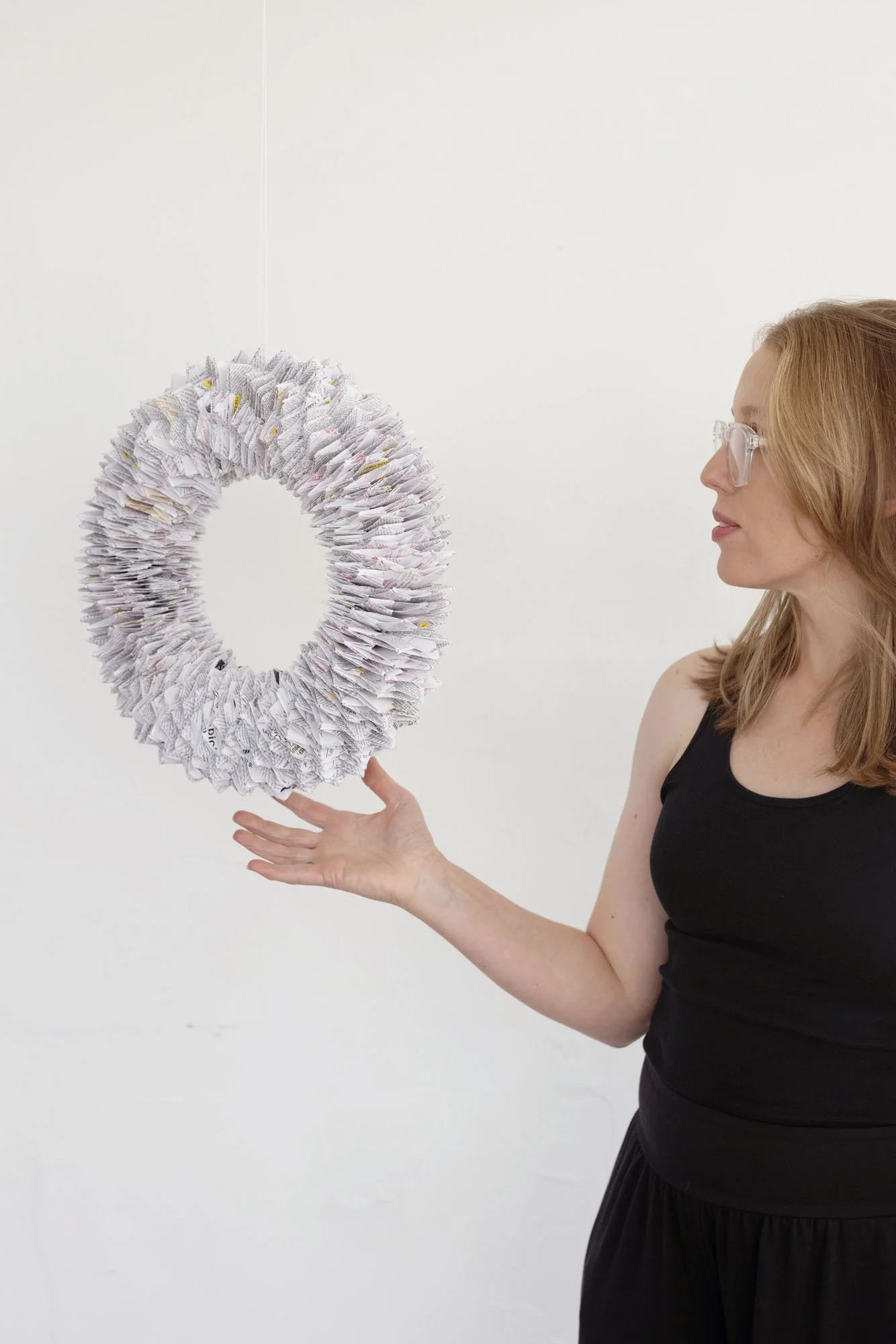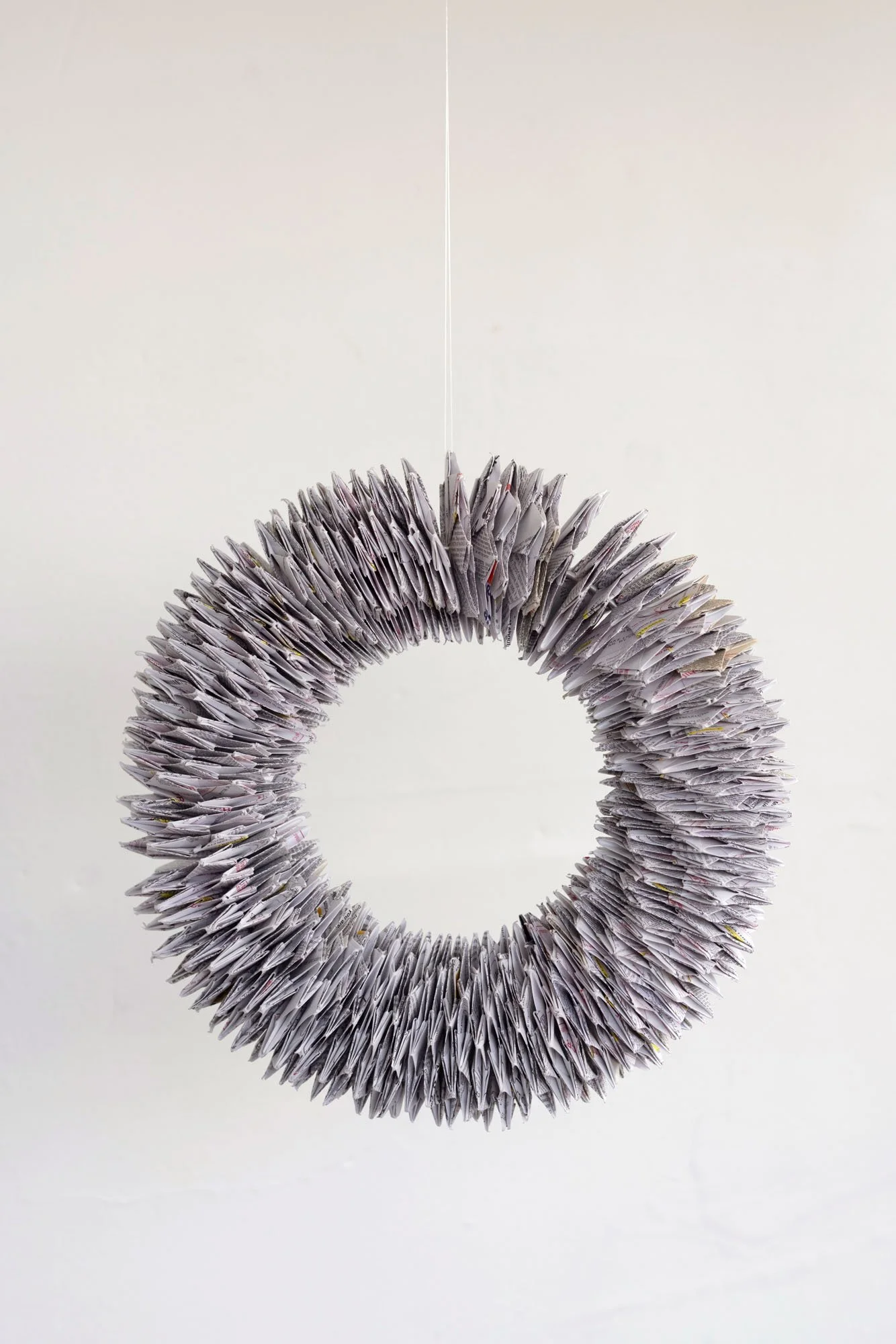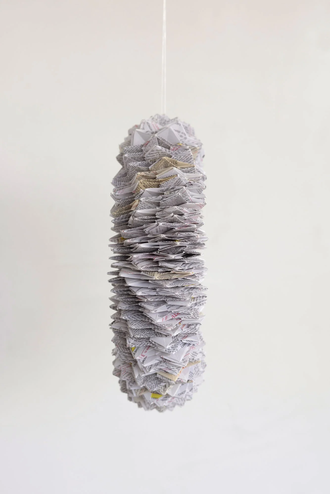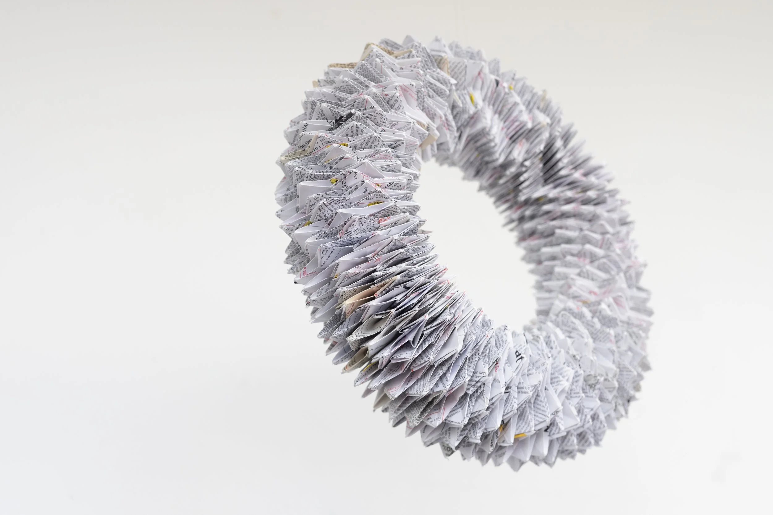 Spiraling paper loop of individual origami elements made from prescription sheets, suspended 2020-2024.